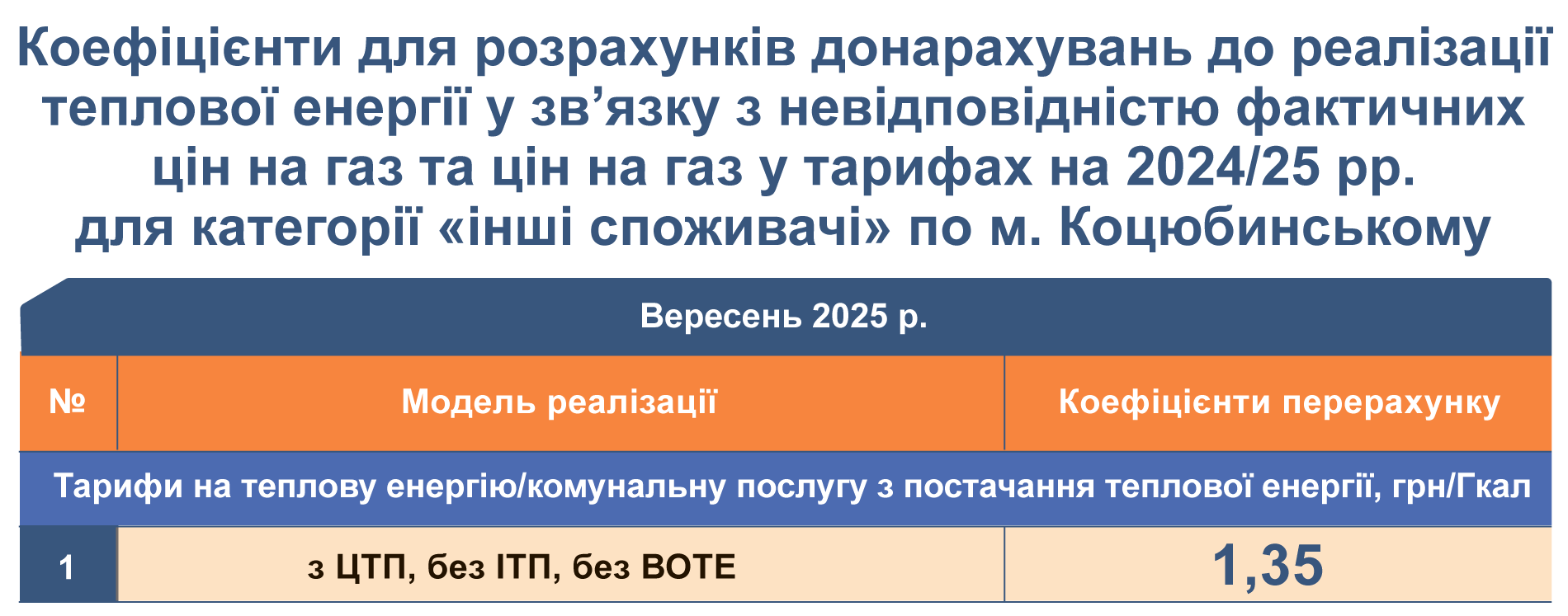 Перерахунок за вересень 2025 року для споживачів категорії «Інші» (сел. Коцюбинське) буде відображений у рахунках, які клієнти отримають у жовтні 2025 року.
